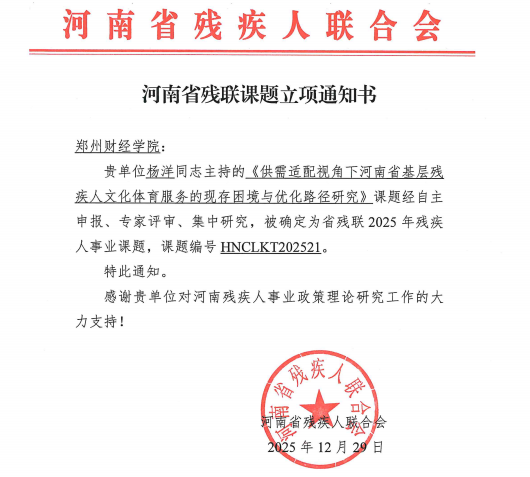 此次课题立项,充分彰显了我校在服务民生事业、助力特殊群体发展方面的责任担当与科研实力。未来,学校将持续为项目研究提供全方位支持,推动研究成果有效转化落地,为健全河南省基层残疾人文化体育服务体系、增进残疾人群体福祉贡献高校智慧与力量。